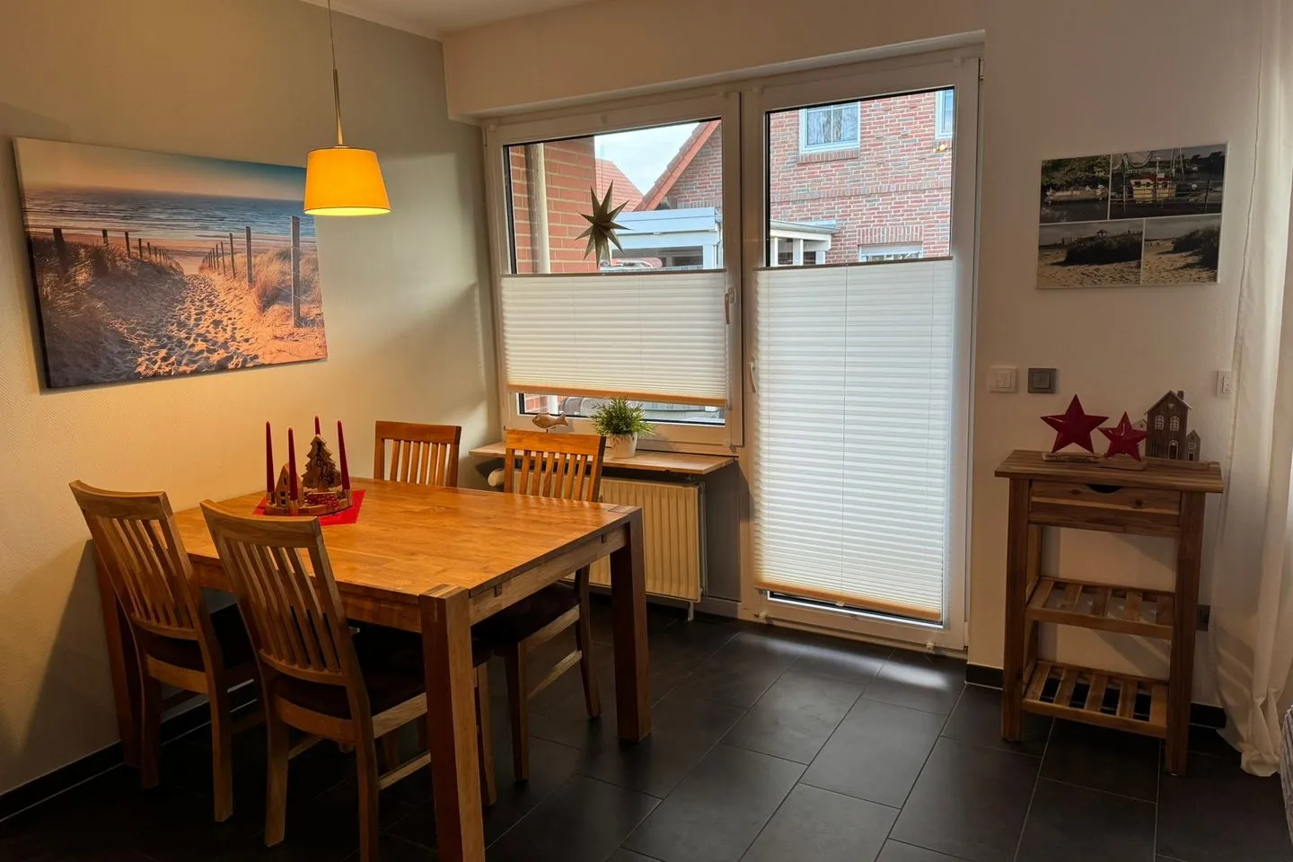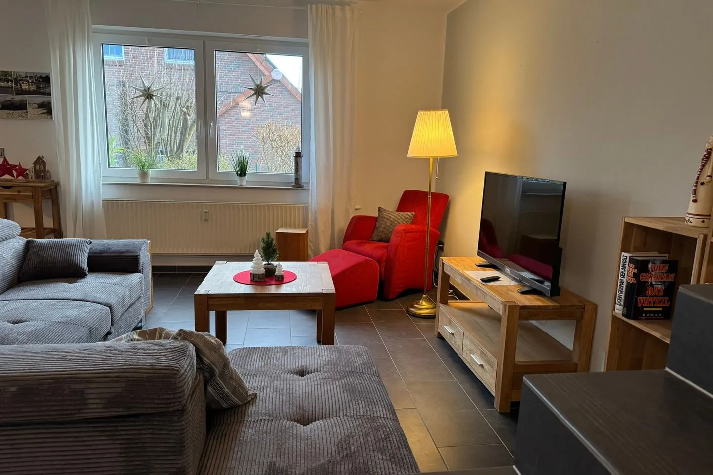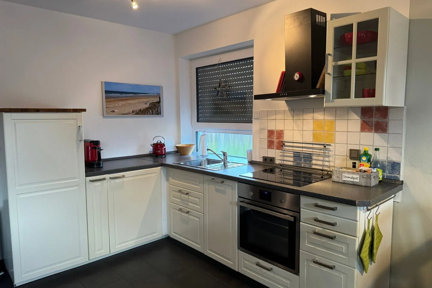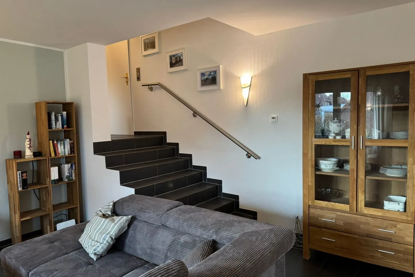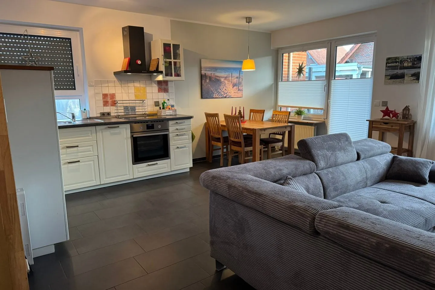 Der großzügig geschnittene Wohnbereich erstreckt sich über das Tief- und Hochparterre und ist mit Fliesen sowie einer gemütlichen Sofaecke, einem Sessel und einem Esstisch ausgestattet. Ein WLAN-Internetzugang mit mindestens 8 Mbit/s sorgt für Unterhaltung und die Möglichkeit zum Arbeiten oder Surfen im Internet. Die an den Wohnbereich grenzende offene Küche ist hochwertig und komplett ausgestattet: Sie finden eine Spülmaschine, einen Backofen (Elektro, Ceran-Kochfeld), einen Kühlschrank mit Gefrierfach, Kaffeemaschine, Toaster, Wasserkocher sowie sämtliches benötigtes Küchenzubehör, Geschirr und Besteck.