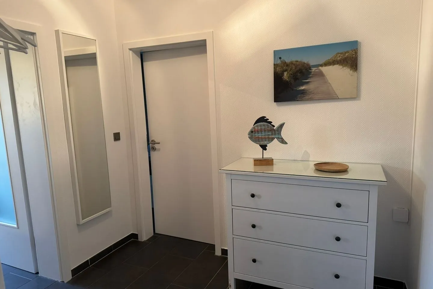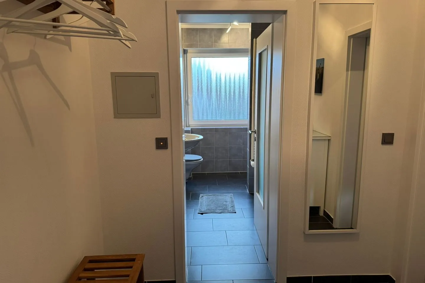 Das Schlafzimmer ist separat und bietet ausreichend Stauraum, eine Kommode sowie einen Ganzkörperspiegel. Im Tageslicht-Badezimmer erwartet Sie üblicher Komfort mit Dusche, Waschbecken und Spiegel. Die Unterkunft ist für Nichtraucher ausgelegt.